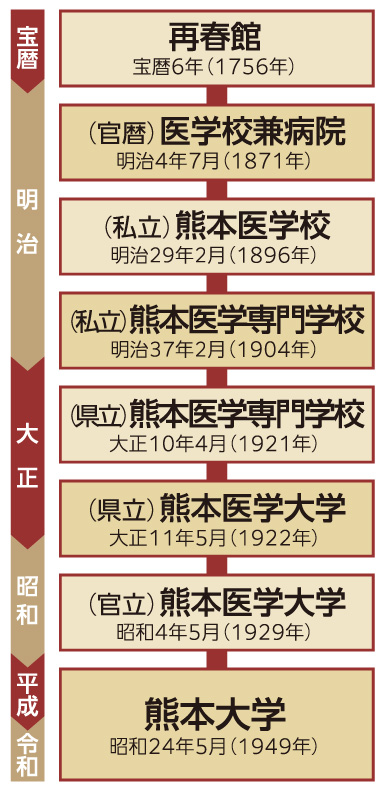 福田 熊本は医学に早くから力を注いできた地です。宝暦6年1756年に、藩主の細川重賢公が医学の藩校「再春館」をつくりました。さらに1871年、細川護久公が、オランダ人医師のマンスフェルトを招いて「古城医学校」を開きました。そうした古い歴史や伝統が熊本大学医学部に脈々と引き継がれていると考えます。