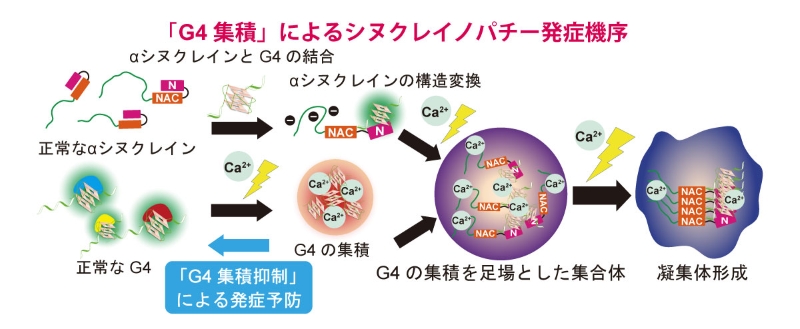 ![]() 「G4集積」によるシヌクレイノパチー発症機序の図 |