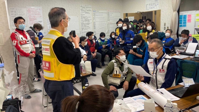 2024(令和6)年の能登半島地震では、私もDMAT隊員として被災地の支援に行き、奥能登の穴水町の保健センター内に設置された保健医療福祉調整本部で活動しました。私たちは発災後2週間して現地に入ったのですが、それまで、穴水町の避難所における医療支援はうまくコントロールされていませんでした。私が責任者となり、保健師さん、日本医師会のJMATチーム、精神科や歯科チームなどが効率よく活動できるよう、情報収集を元にどのチームをどこへ派遣するか、その調整を行いました。さらには、寄せられた情報をもとに避難所アセスメントを行い、たとえばトイレに困っているとか水に困っているとか、その情報をもとに対応。また、避難者の方々にダンボールベッドをもっと活用してもらうために、まずは展示を行って見てもらうなどの活動も行いました。