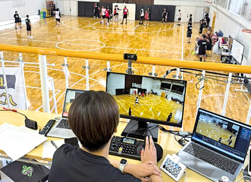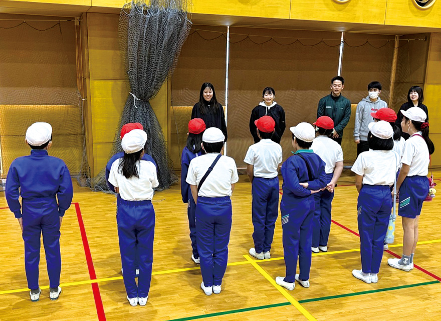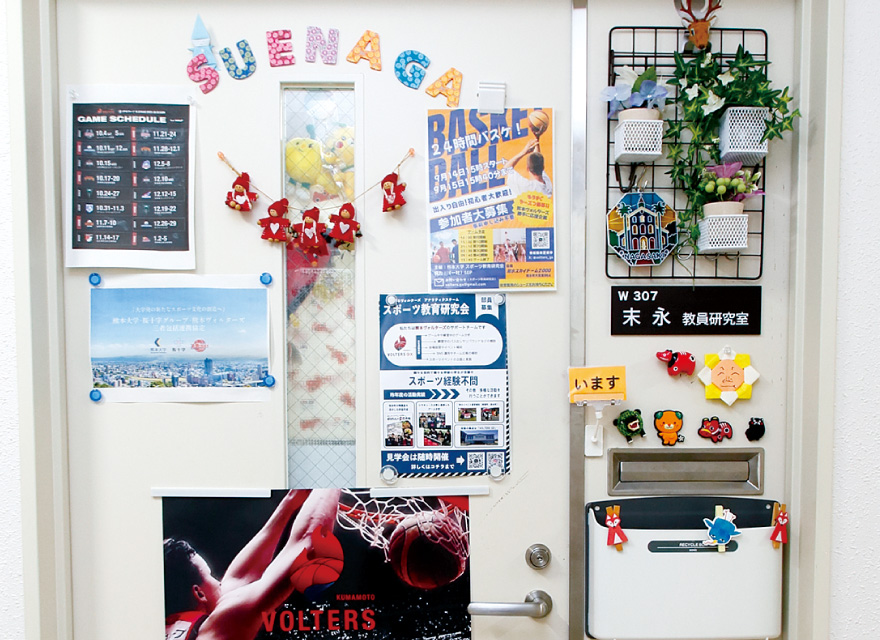 熊本大学大江総合運動場にある渡鹿体育館は、熊本ヴォルターズが練習施設として活用しています。ここでの様々な活動が末永准教授の研究対象。戦術や対戦相手のデータ分析も行いチームへフィードバックしています。データの取得は学生たちも協力。学生がプロスポーツチームの強化に関わる取り組みをする大学は珍しいそう。そのほか、末永准教授が前任大学で、吉本興業の芸人さんに依頼して作った「投能力向上ダンス」をアレンジした「ヴォルターズリズム体操」を取り入れた実証体育授業を、熊本市内の2小学校で実施しています。