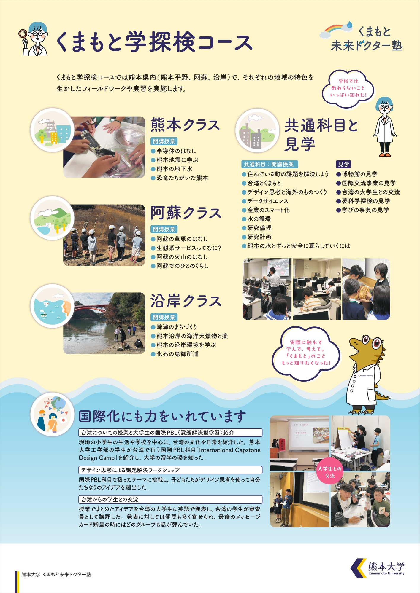| イベント | ★トークイベント(要申込・参加無料) 令和8年3月14日(土)14:00~15:00 『くまもと未来ドクター塾の学び発表会』 (登壇者)くまもと未来ドクター塾コーディネーター 生野 朋子 先生 (熊本大学教育統括管理運営機構 特定事業教員) くまもと未来ドクターコース受講生(小学校6年生、中学校2年生) |